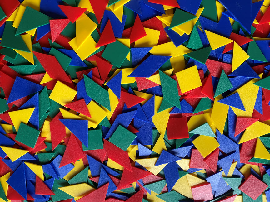 Our Tangram Bible Story Books are supplied with a 7-piece plastic puzzle known as a tangram. The pieces are shaped as shown above with dimensions allowing them to fit together to form thousands of figures and shapes. There are four simple rules for arranging the puzzle pieces:1 - All seven pieces must be used